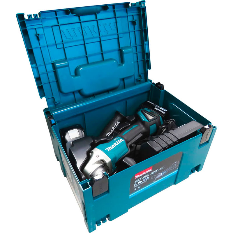 2 baterias 18V 5,0 Ah, carregador rápido, disco de desbaste, punho lateral e Mak-pac N°3.